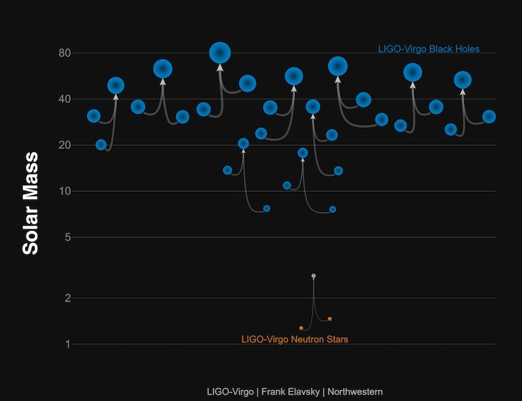 Immagino che le fusioni di BN e quelle di stelle di neutroni siano correlate tra loro in maniera esponenziale: più piccole le masse coinvolte, maggiore il numero di eventi.