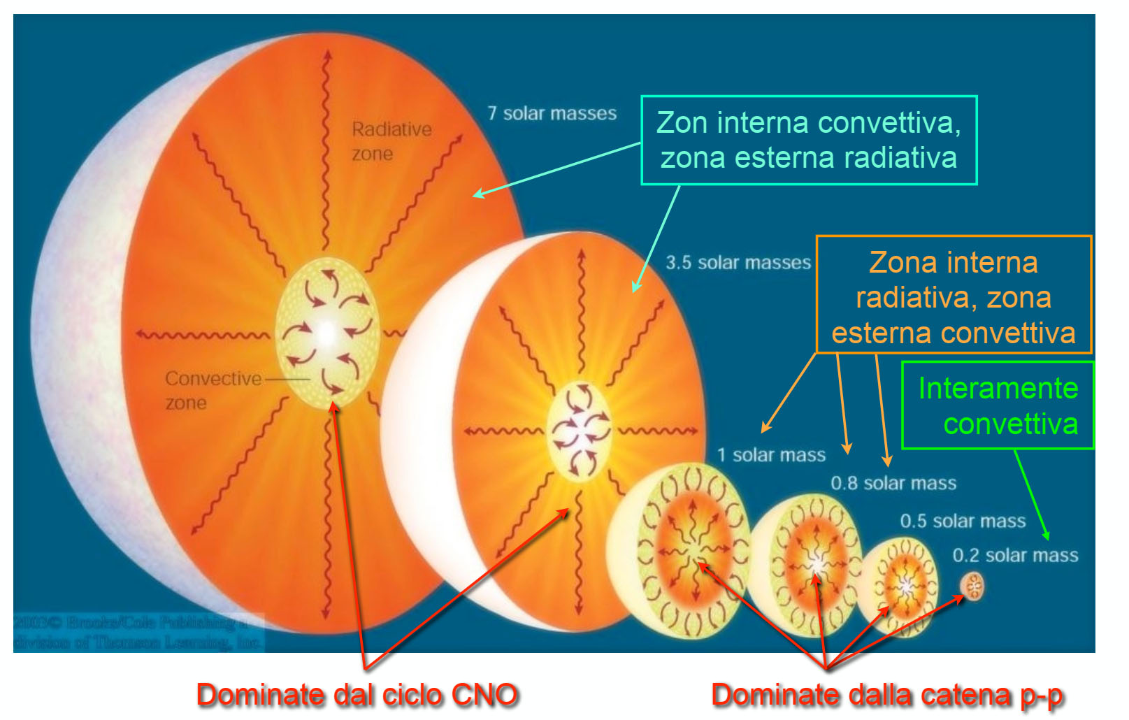 Per astri con una composizione chimica simile a quella solare, la reazione CNO diventa la fonte principale di energia oltre le 1,3 masse solari, mentre al di sotto è il ciclo P-P ad essere fondamentale.