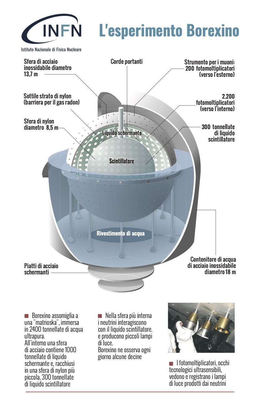 Naturalmente, dato che i neutrini interagiscono debolmente con la materia, si è dovuto elaborare un esperimento che li rilevasse indirettamente, mediante l’emissione che determinano in certi casi quando si scontrano con la materia. Pur essendo poco interagenti con la materia, sono talmente tanti che si possono rilevare diverse decine di interazioni al giorno.