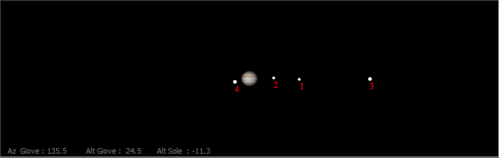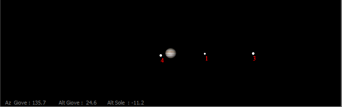 in questo preciso istante Europa (indicato nel diagramma con 2) entrerà nell'ombra di Giove, di fatto scomparendo alla vista: all'improvviso perciò i satelliti da 4 diventeranno 3...