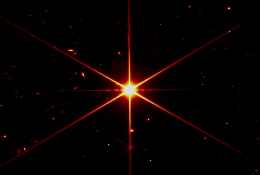 Questa fotografia (già famosissima) è quella che il JWST ha scattato alla stella 2MASS J17554042+6551277 dopo la prima fase di allineamento degli specchi. La stella, sebbene distante 2000 anni luce, abbaglia il telescopio e satura il suo rivelatore nel vicino infrarosso.