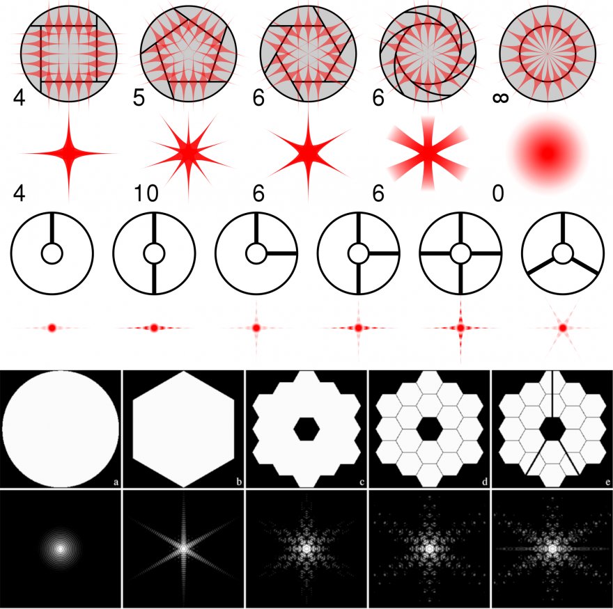 La sovrapposizione degli effetti di diffrazione è ben descritta dall'immagine seguente che illustra vari casi di complessità crescente, sia per sistemi ottici semplici che per l'avanzato telescopio James Webb