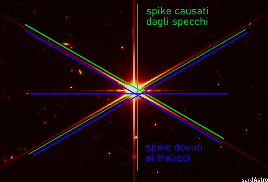 Riusciamo ora a spiegare come si sono generati alcuni degli spike della foto del JWST, ovvero per "colpa" dei tre tralicci che sorreggono lo specchio secondario e che danno luogo a 3 fasci luminosi: quello orizzontale (dovuto al traliccio attaccato alla parte superiore della struttura) e quelli obliqui (causati dai due tralicci inferiori).