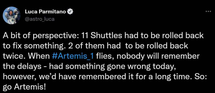 "11 Shuttle sono dovuti essere riportati indietro per aggiustare qualcosa. 2 di essi sono stati portati indietro 2 volte. Quando Artemis 1 volerà nessuno si ricorderà dei ritardi. Tuttavia, se oggi fosse andato storto qualcosa, ce lo saremmo ricordato per molto tempo. Go Artemis!"