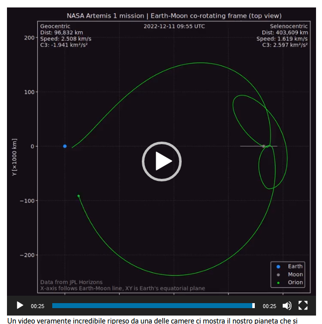 approfitto del passaggio per dire che sto controllando giorno per giorno (direi anche più volte al giorno) il sito HORIZONS per scaricare i dati di posizione dell'Orion (e della Luna ovviamente) da dare in pasto al mio programma di visualizzazione delle orbite in 3D, che uso sempre per le sonde più importanti.