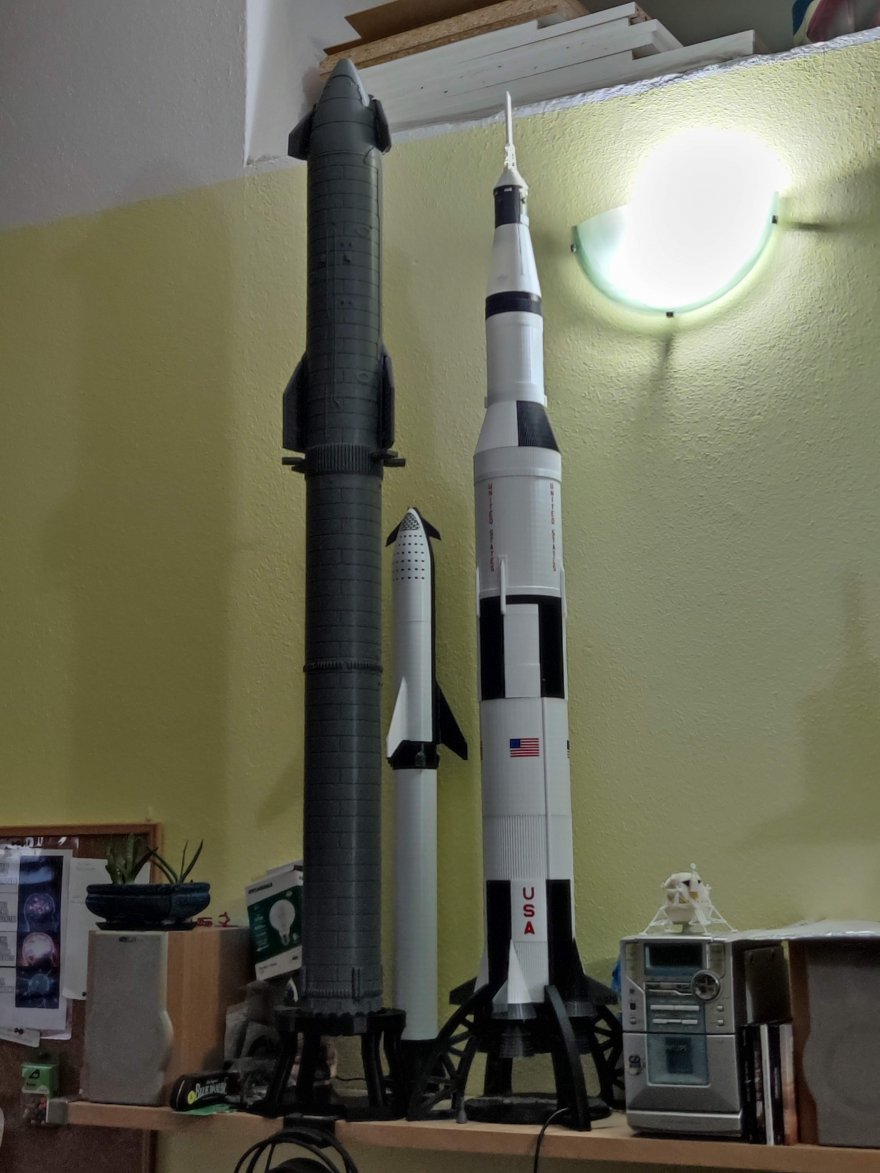 Qui è ritratto a fianco a un vecchio design di Starship (non ricordo la scala esatta) e all'attuale design di Starship + SuperHeavy (anch'essi scala 1:60). Sullo stereo c'è il LEM dispiegato, anch'esso 1:60