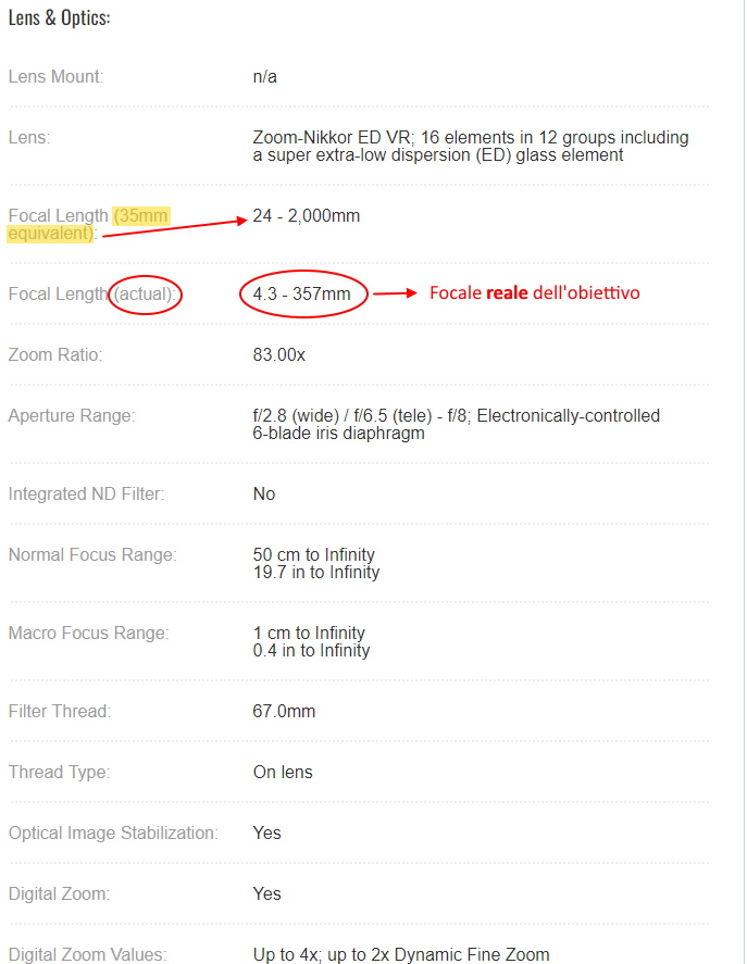 Usando una P900 non stai scattando a a 2000 mm di focale, ne tantomeno a 4000 mm, il range di focali da 24 a 4000 mm che si trova nei datasheet è equivalente, ovvero che il fattore di riproduzione sul sensore della P900 (pari a 6,17 x 4,55 mm) sarebbe pari a quello di un sensore FF (36 x 24 mm) alle focali di 2 e 4 metri.