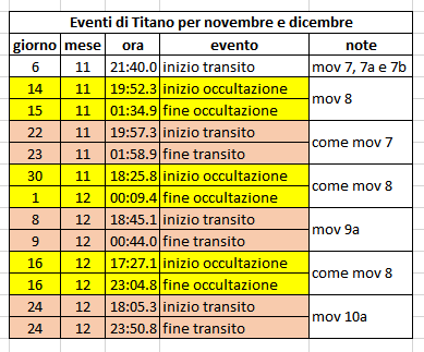 Iniziamo dunque dalla tabellina che raccoglie i vari eventi di Titano per i prossimi mesi di novembre e dicembre