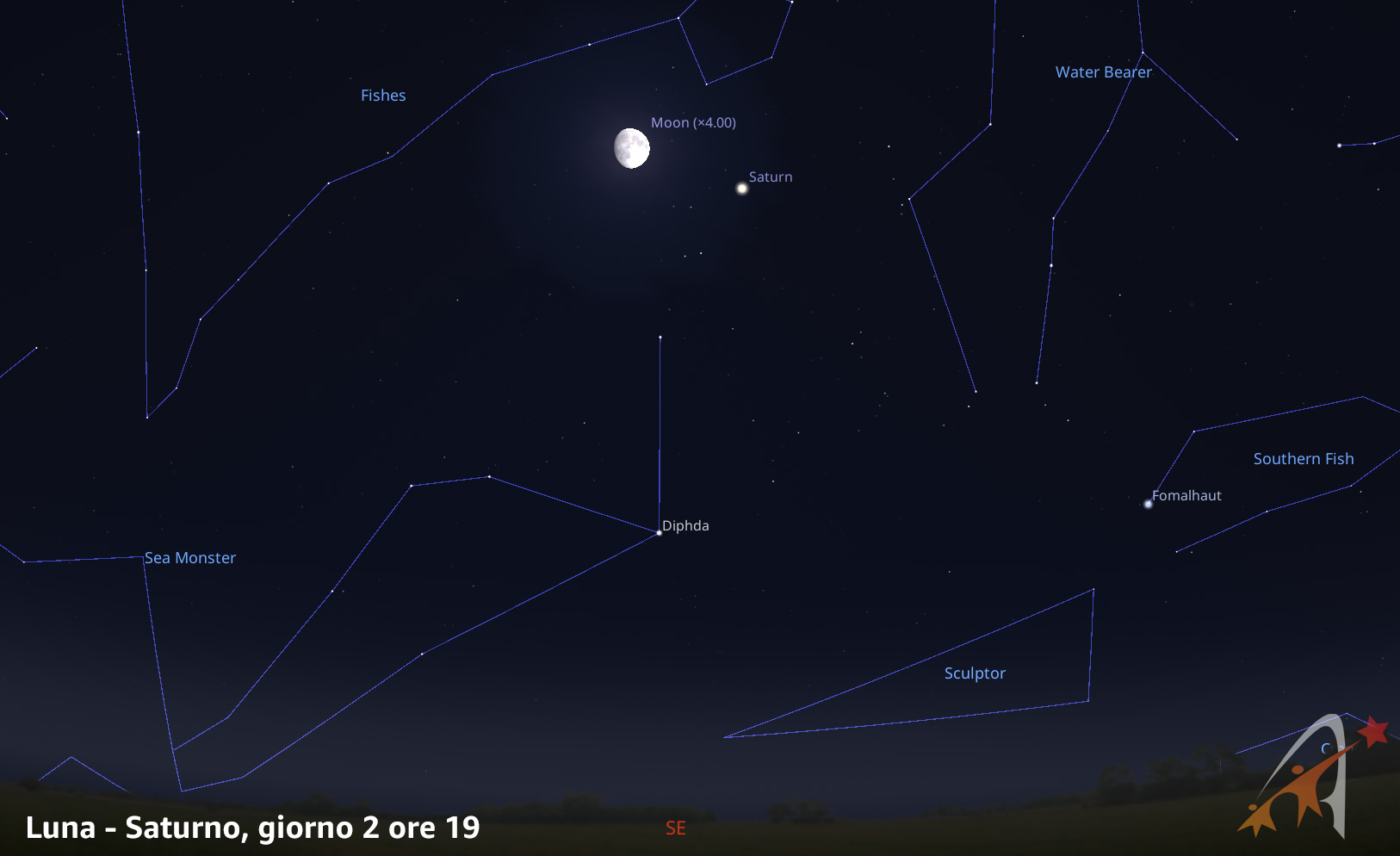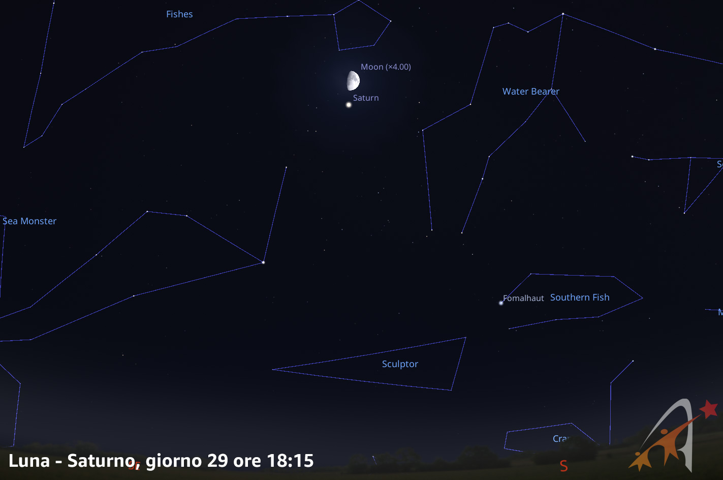 In prima serata Saturno ha già in culminazione a Sud. Abbiamo pertanto qualche ora per accompagnarlo lentamente in direzione occidentale, fino a dopo la mezzanotte. Saturno sta attraversando la costellazione dell’Acquario.