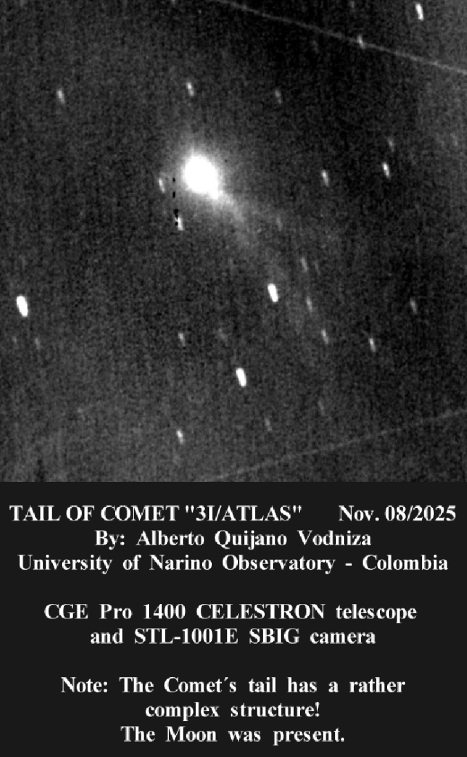 Si tratta dell’ottimo contributo da parte di un Astronomo che abbiamo incontrato altre volte su queste pagine, Michael Jaeger dall’Austria, il quale afferma che “abbiamo un qualcosa di strano da segnalare, perché la 3I/ATLAS ha mostrato una struttura molto complessa della coda la mattina dell’8 novembre”.