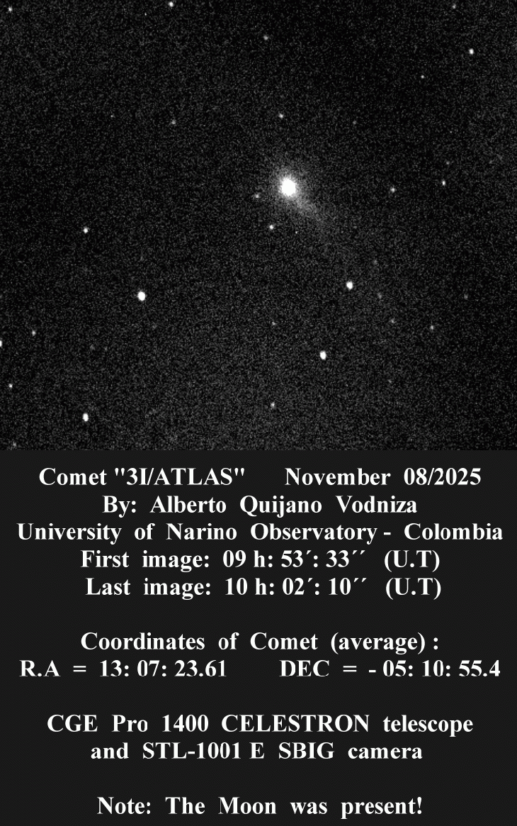 Si tratta dell’ottimo contributo da parte di un Astronomo che abbiamo incontrato altre volte su queste pagine, Michael Jaeger dall’Austria, il quale afferma che “abbiamo un qualcosa di strano da segnalare, perché la 3I/ATLAS ha mostrato una struttura molto complessa della coda la mattina dell’8 novembre”.