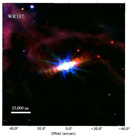 Infine la stella WR 137: a cominciare dal termine “Wolf Rayet“, confesso che conosco davvero poco le caratteristiche di questo tipo particolare di stelle, ad iniziare dal secondo nome, lo scienziato Georges Rayet di cui non riuscivo nemmeno a pronunciare il cognome visto che non ne conoscevo la nazionalità. Grazie all’IA intelligente di Google ho saputo che è francese e si pronuncia “Ra-iè”…
