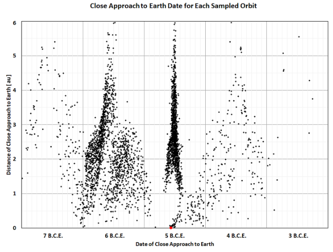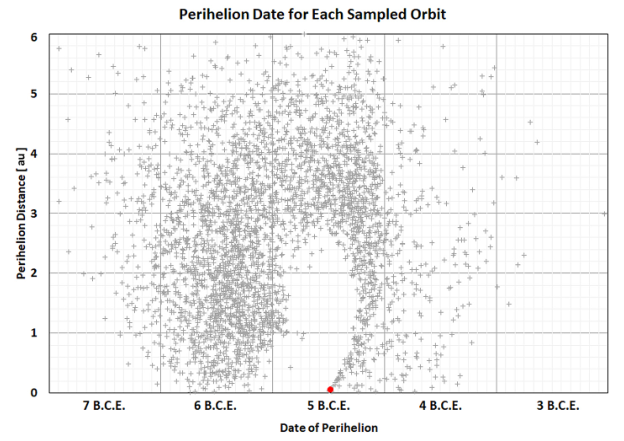 dove si vedono tante crocette corrispondenti ad altrettante comete simulate tra il 7 aC ed il 3 aC e centrate sulla data più probabile del 5 aC : queste comete potrebbero spiegare le osservazioni da parte dei Cinesi, ma quelle a sinistra sono quelle che hanno passato il perielio alla data dell’osservazione cinese mentre quelle a destra non l’hanno ancora passato. Il puntino rosso rappresenta una delle comete papabili, quella dell’8 giugno, passata al perielio a luglio e di cui si parlerà più avanti.