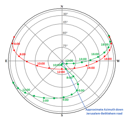 La curva formata da punti verdi rappresenta invece il percorso seguito dalla cometa “dell’8 giugno aC”, sempre ora dopo ora: dalle 6 in poi la cometa mantiene praticamente il proprio azimut (corrispondente alla direzione della strada tra Gerusalemme e Betlemme, indicata dalla retta blu), aumentando piano piano ma decisamente la propria altezza sull’orizzonte per avvicinarsi allo zenit, restando poi praticamente ferma per parecchie ore prima di scendere nuovamente verso l’orizzonte.