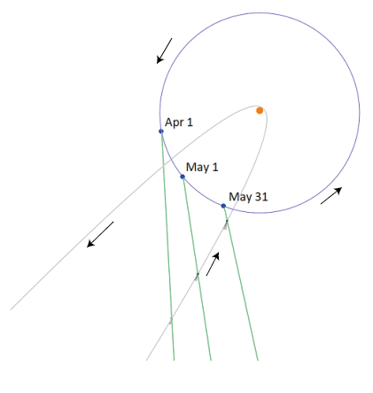 rispetto all’orbita della Terra: nelle tre date indicate per la posizione della Terra, la cometa (della quale si intravvede la coda, opposta al Sole, ovviamente non in scala) si trova nei tre punti corrispondenti della sua orbita molto eccentrica. Le frecce indicano lo spostamento nel tempo della Terra e della cometa.