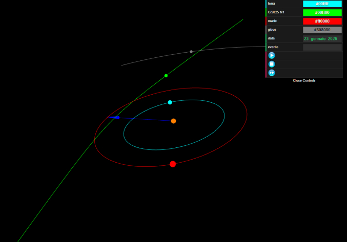 Ho schiacciato il tasto play per 4 volte fino ad arrivare alla data del 19 dicembre 2025 (minima distanza dalla Terra, 1.8 UA), dopodiché ho fatto avanzare la simulazione premendo il tasto single step , per arrivare al 23 gennaio 2026.