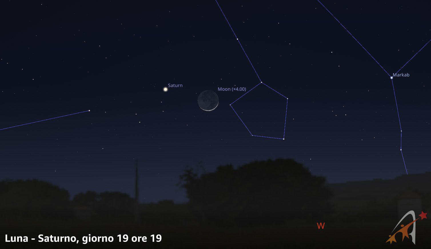 Il giorno successivo, in prima serata, troviamo un falcetto di Luna leggermente più visibile rispetto al giorno precedente. Stavolta, però, a fare compagnia al nostro satellite naturale è Saturno, sempre in direzione occidentale.