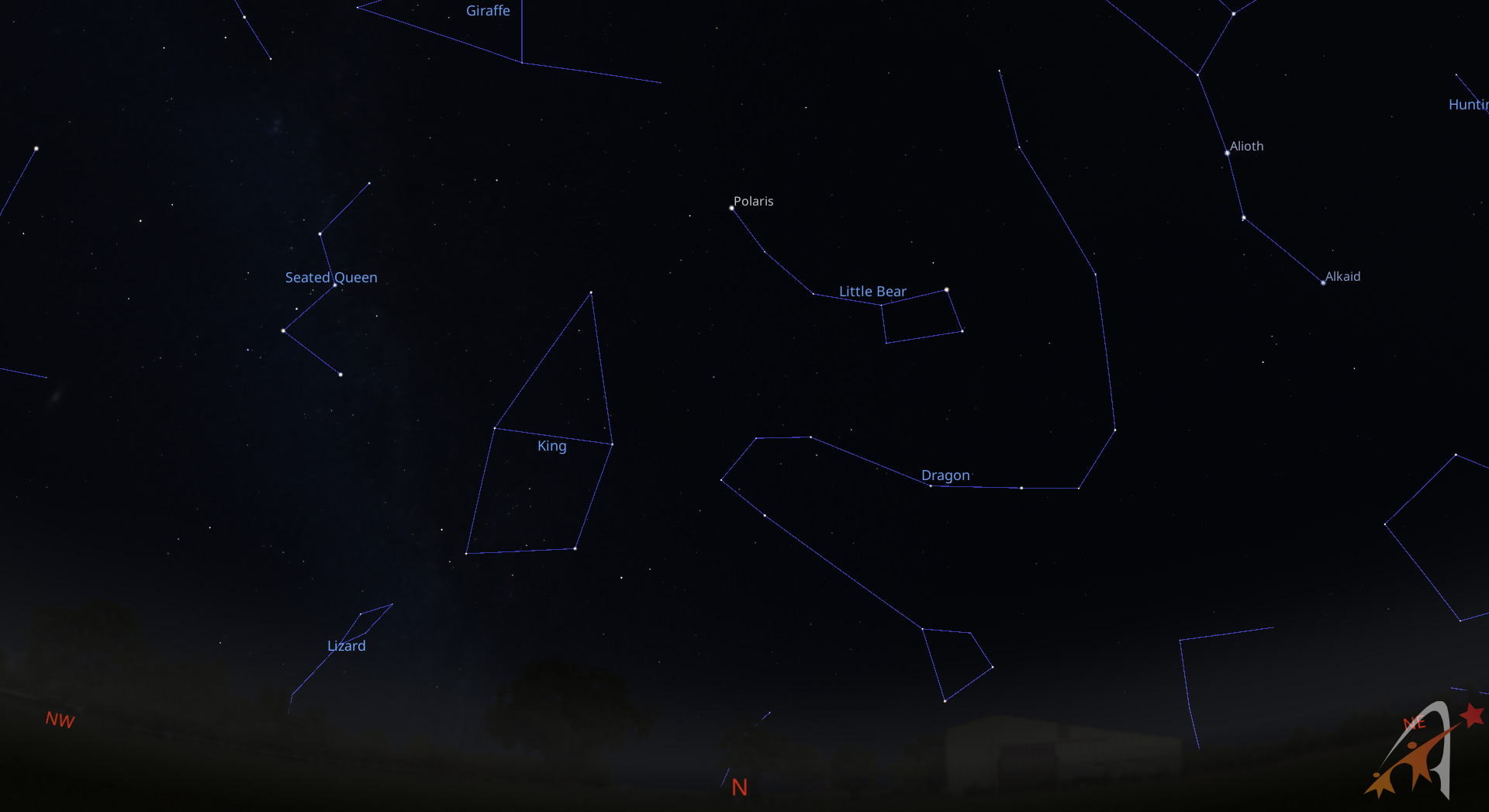Più spostata a Nord-Est si trova l’inconfondibile Orsa Maggiore, vicino alla quale possiamo riconoscere la piccola costellazione dei Cani da Caccia.