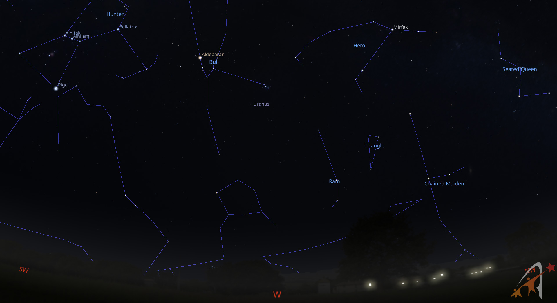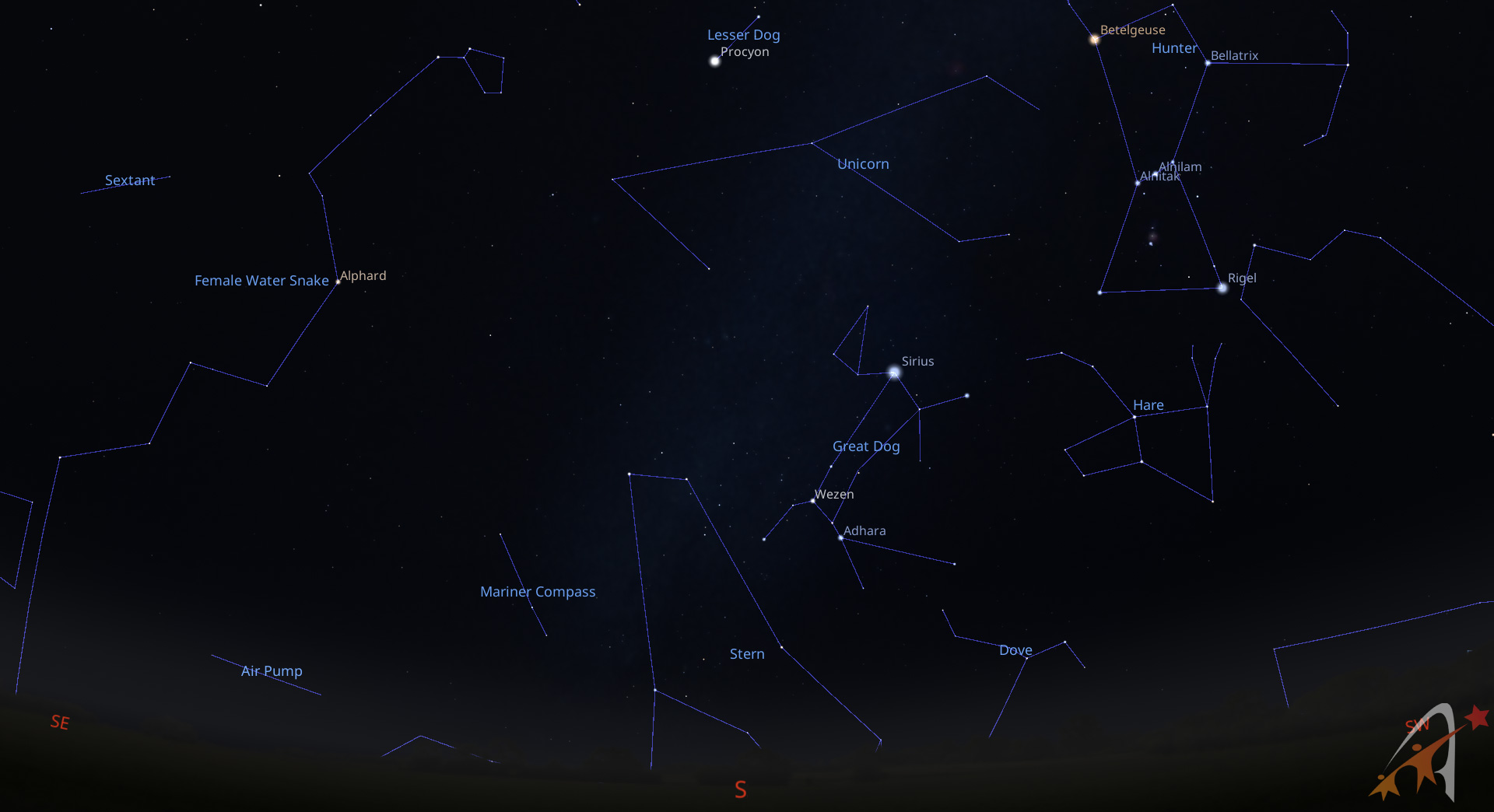 Il cielo è ancora dominato dalle grandi costellazioni invernali. Protagonista del cielo in direzione meridionale è sempre Orione, con le tre stelle allineate della cintura (da sinistra: Alnitak, Alnilam e Mintaka) ed i luminosi astri Betelgeuse (rossa) e Rigel (azzurra).