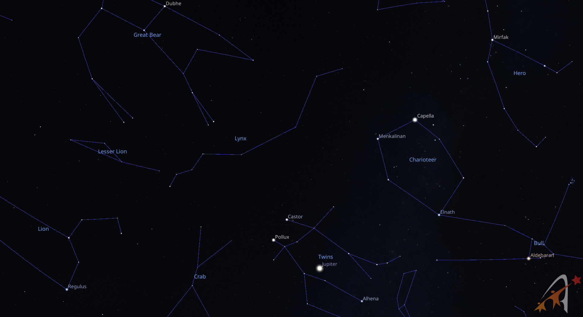 Più in alto troviamo ancora le costellazioni del Toro con la rossa Aldebaran, la costellazione dell’Auriga con la brillante stella Capella, i Gemelli con le stelle principali Castore e Polluce. A sinistra in basso rispetto ad Orione, il grande cacciatore, nella costellazione del Cane Maggiore, brilla la notissima Sirio, la stella più luminosa del cielo.