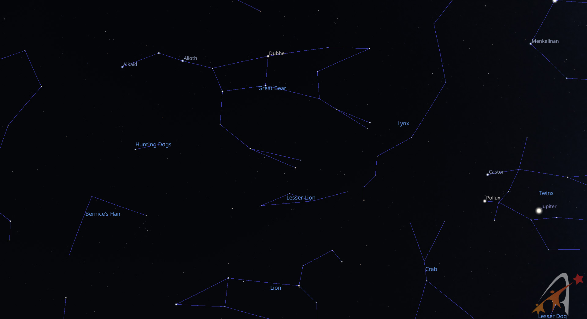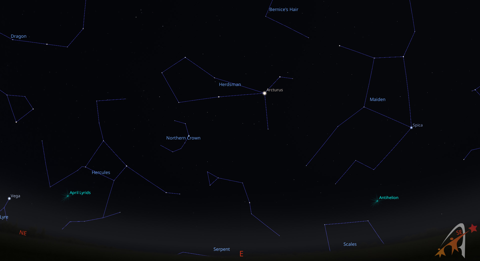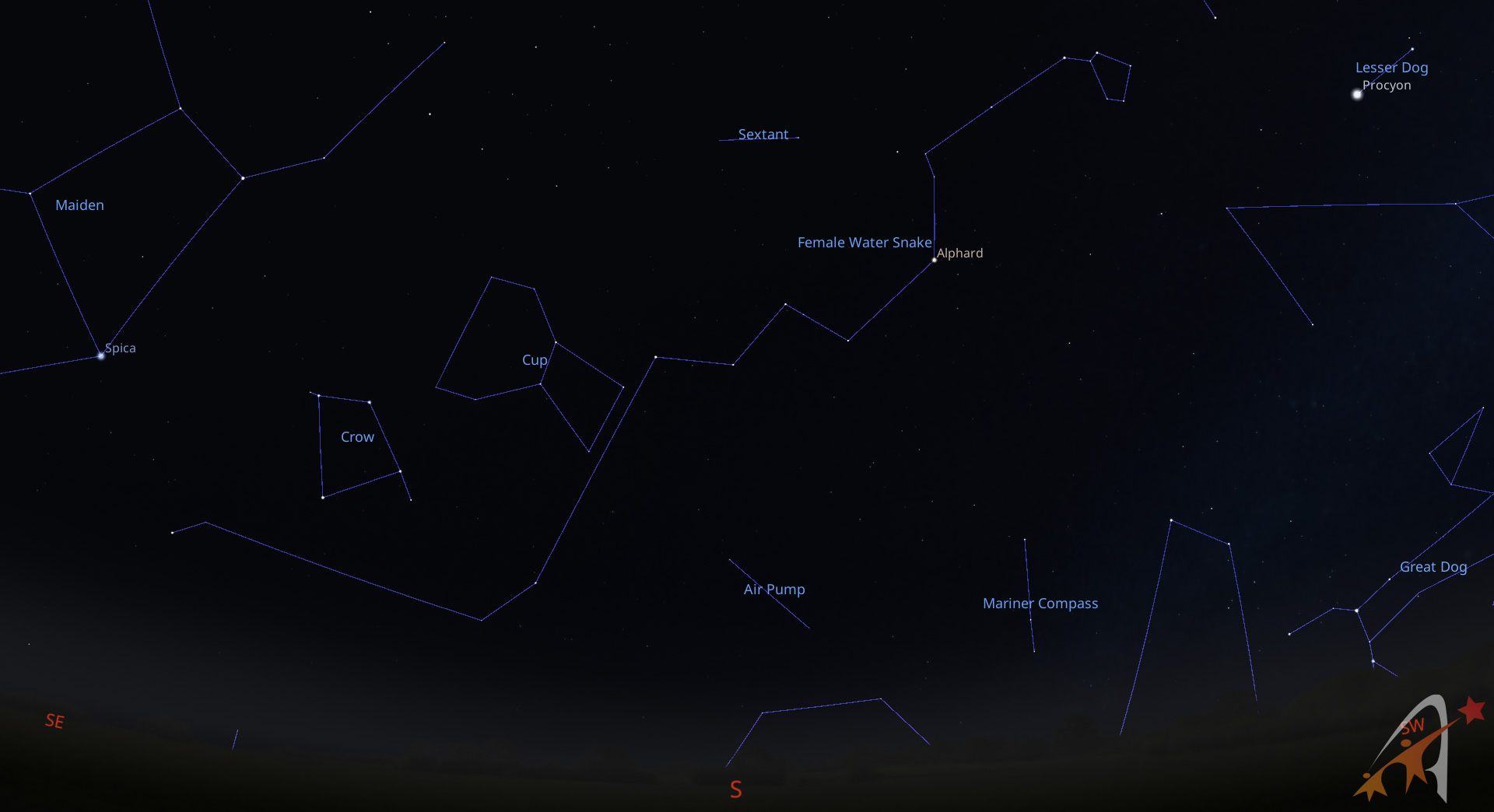Nel corso della notte le costellazioni invernali tramontano del tutto per lasciare spazio al vero e proprio cielo estivo. Abbiamo quindi il Cancro e il Leone, con la brillante Regolo. Nel cielo di sud-est, a notte inoltrata, sorgono la Bilancia e successivamente lo Scorpione, caratterizzato dalla gigante rossa Antares.