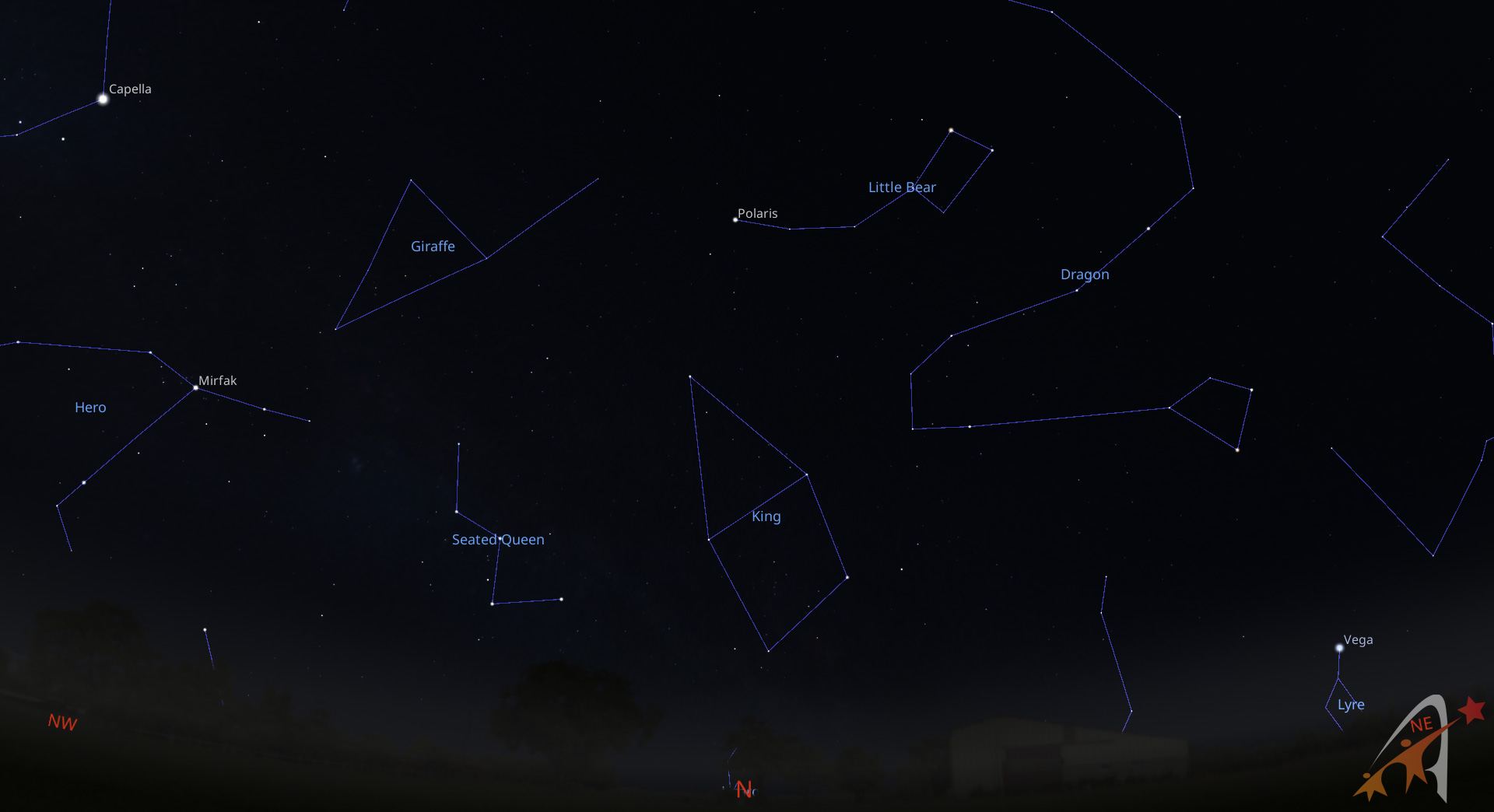 Terminiamo il tour con una breve descrizione del cielo settentrionale, caratterizzato dalle classiche costellazioni circumpolari (che ruotano attorno al Polo Nord Celeste). Il periodo è favorevole all’osservazione dell’ Orsa Maggiore (riferimento per trovare la stella polare) poichè si trova nel punto di massima altezza sull’orizzonte, definito “culminazione”. Si prosegue con Cassiopea, dalla classica forma a “W”, a seguire Cefeo e il Dragone.