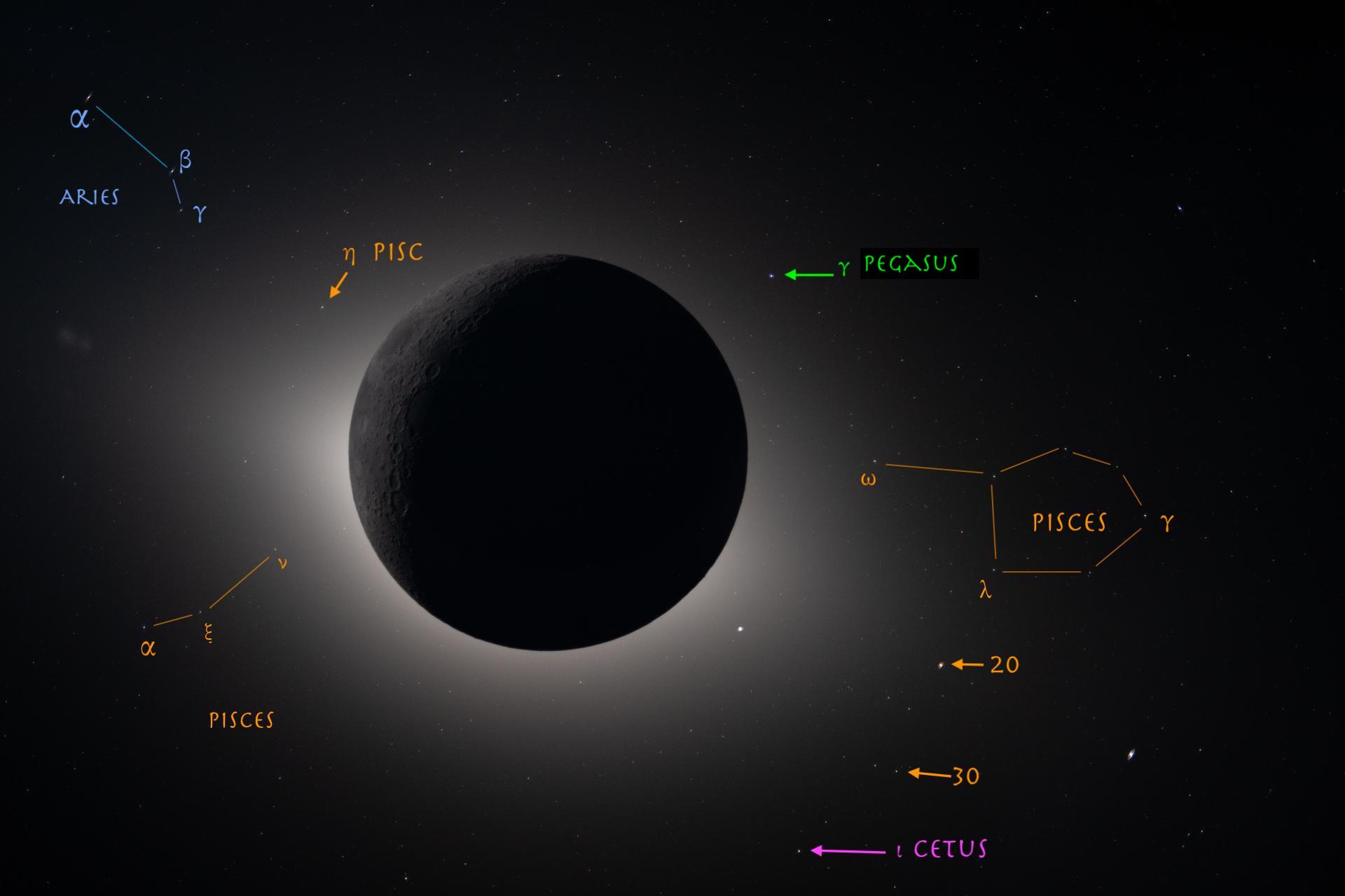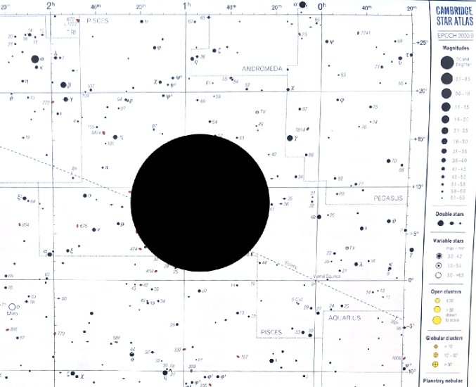 Partendo da questa mappa stellare, con sovrimpresso il disco nero della Luna (cliccandola si vedrà la mappa in alta risoluzione)