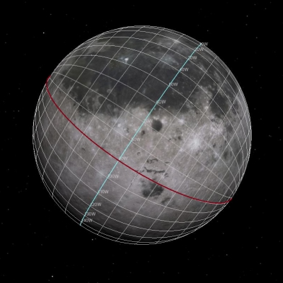 Ora, il limite della faccia della Luna visibile dalla Terra è praticamente il meridiano identificato con “90W” (che sono riuscito a tracciare in rosso): quindi la parte in basso è quella che non si vede dalla Terra.