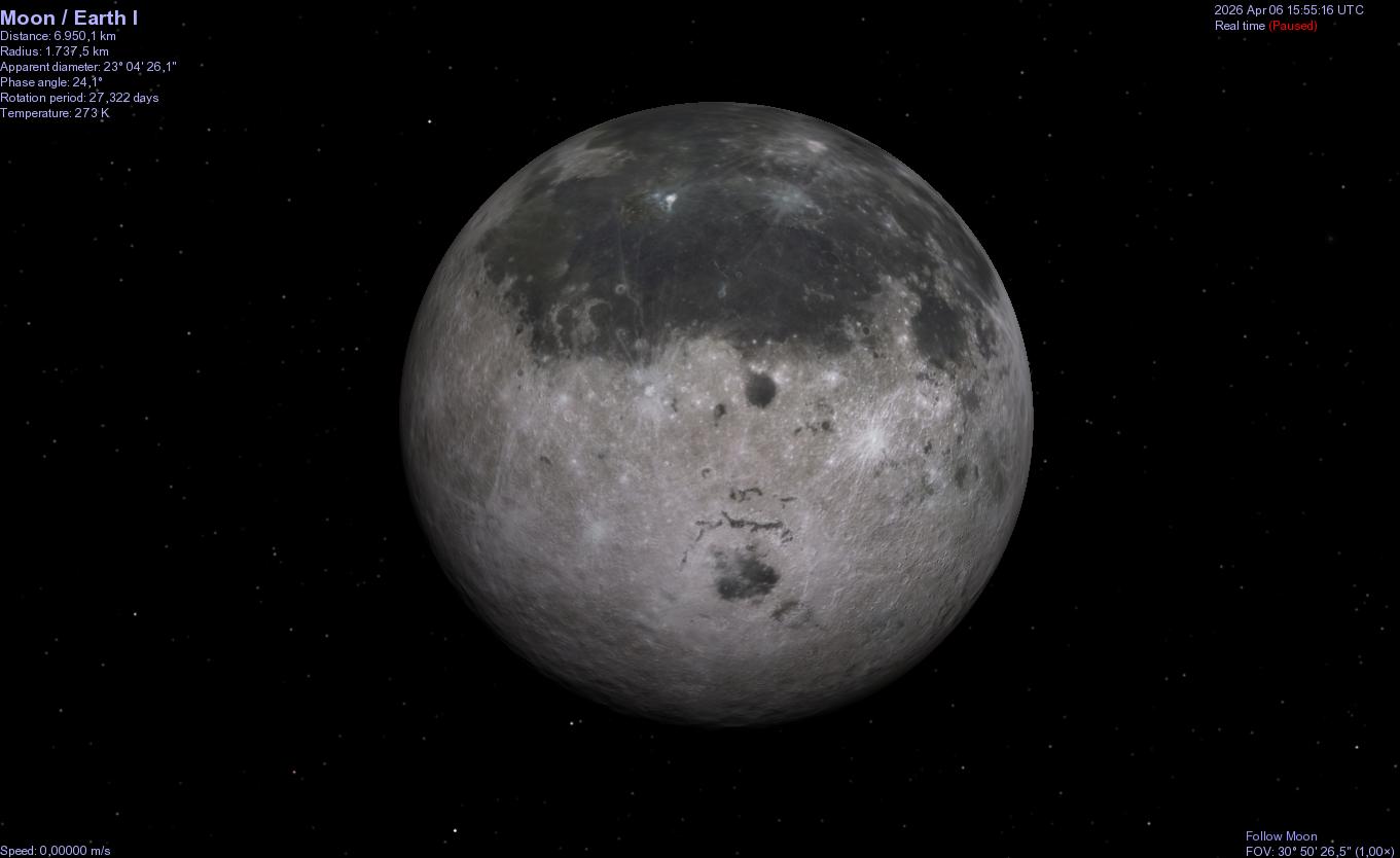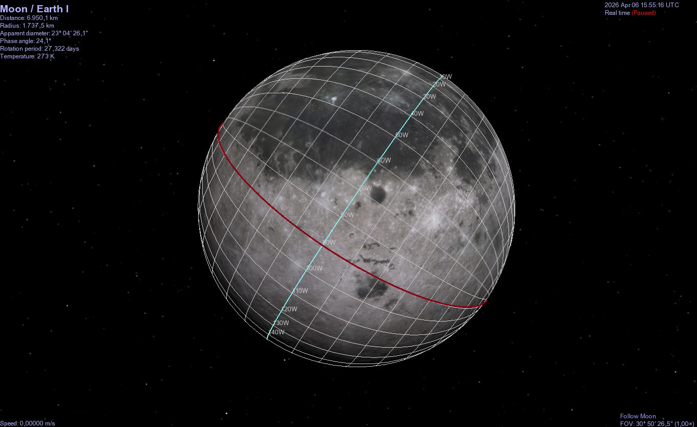 Ho voluto divertirmi con Celestia (il vecchio ma sempre preciso programma per PC, che negli anni ho utilizzato laddove ne sorgeva la necessità) per cercare di riproporre l’immagine del lato nascosto e osservato dai quattro astronauti.