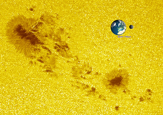che si può vedere già da qualche giorno attraversare il disco del Sole e la cui grandezza è paragonata con la nostra Terra con a fianco la Luna.