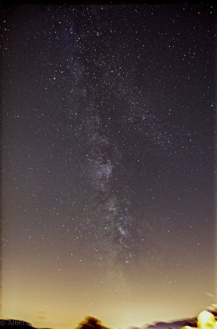 Ieri sera deludente serata osservativa col c8, conclusasi praticamente prima ancora di partire causa turbolenze, nonostante una notevole trasparenza del cielo. Molto in breve: ho ripiegato sull'osservazione ad occhio nudo e scorgendo ad un certo punto una tenue velatura nel cielo sud, mi scatta il pallino della "prova fotografica": vi presento la mia prima..Via Lattea! :wub:
