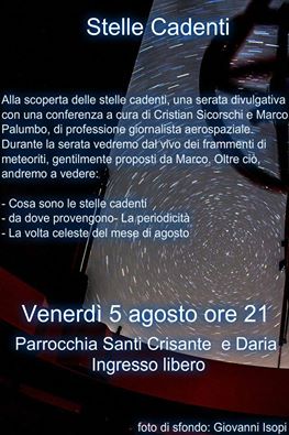 Dopo SpazioItalia ( la quale prossima edizione dev'essere definita ) mi hanno chiesto di tenere una conferenza in occasione della notte di San Lorenzo. Come dire no !