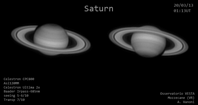 Saturno si sta avvicinando all'opposizione. Di conseguenza, l'ombra sull'anello del pianeta si sta restringendo sempre di più, a causa della diversa prospettiva che sta assumendo rispetto alla terra. Queste mie due riprese si distanziano di quasi 20 giorni, ma si può vedere molto bene il movimento dell'ombra. L'altra ripresa è quella di stanotte, in condizioni di discreto seeing.