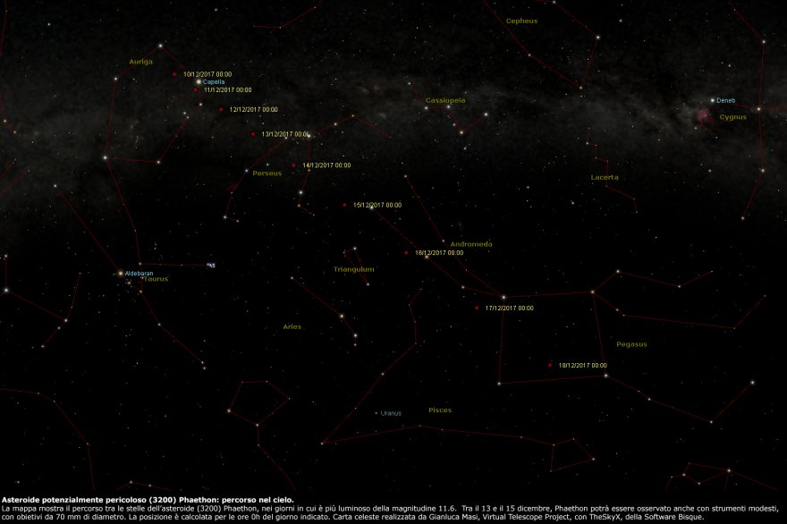 Mi riferisco a 3200 Phaeton che è entrato nelle cronache perché c'è la conferma che il 16 dicembre raggiungerà la distanza di 6,4 milioni di miglia dalla Terra. Sarà il punto più vicino alla Terra in cui questo asteroide si troverà dal dicembre 1974, quando era a circa 5 milioni di miglia di distanza.