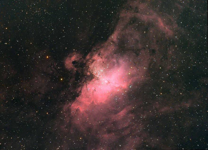 Ho provato ad unire il tuo Halpha leggermente modificato nei contrasti con il tuo LRGB con la funzione HaRVB-AIP e correggendo un po' i colori e basta. Tieni conto che nella M16 vi è molto OIII e quindi non avrai rossi puri ma tendenti al rosa.
