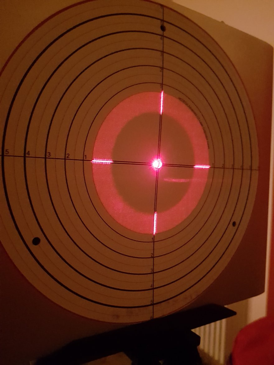 Ho letto su un forum inglese che qualcuno per verificare se i laser sono paralleli tra di loro, ha stampato la parte frontale del collimatore, per poi posizionarla a una distanza di 2,5 metri (circa) dal collimatore, e in fine si verifica se i tre laser entrano all'interno dei tre punti stampati sul foglio.