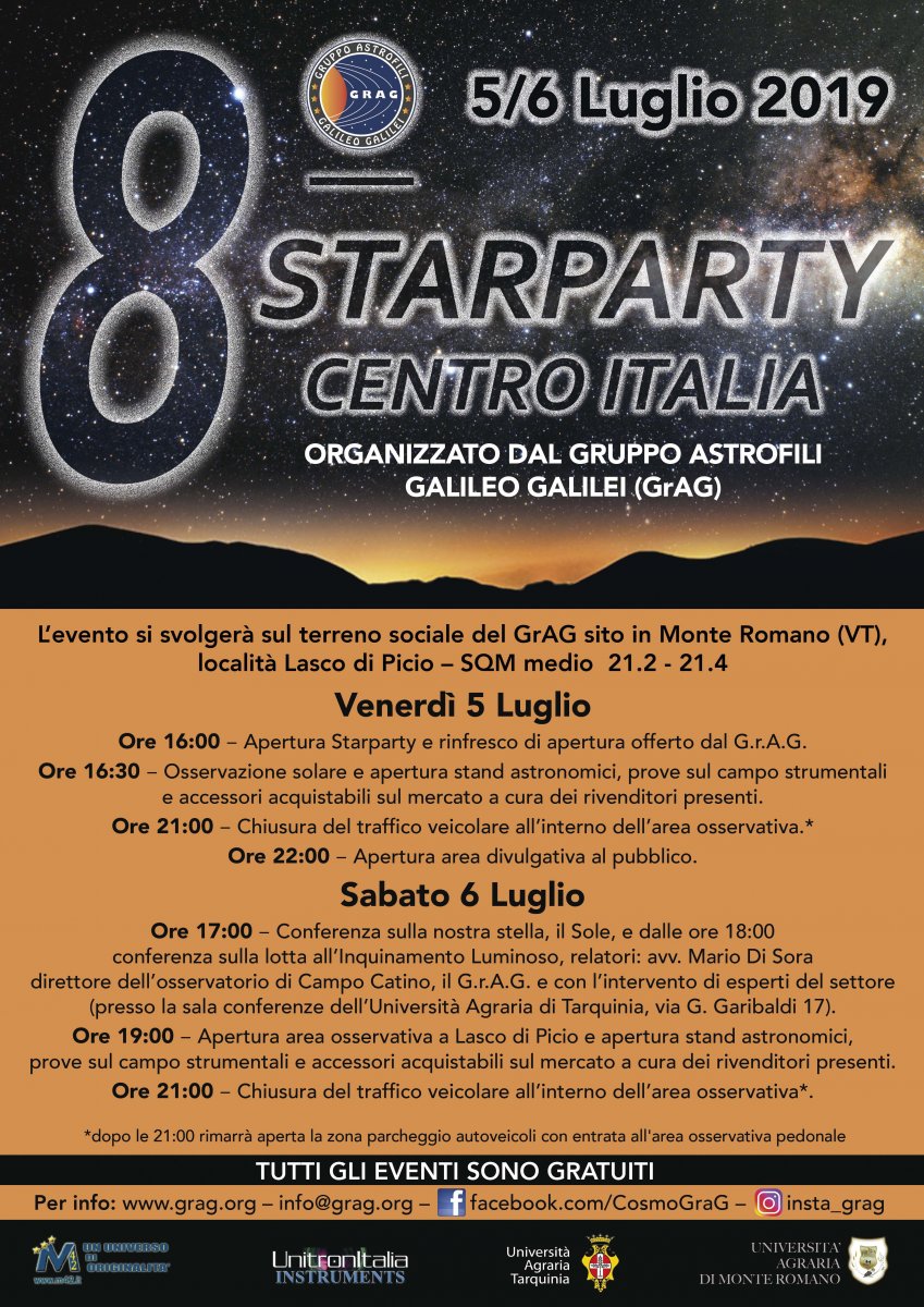 Il GrAG, Gruppo Astrofili Galileo Galilei di Tarquinia presenta l’8° raduno astronomico nazionale del Centro Italia che si svolgerà nelle date del 5/6 luglio 2019 a Monte Romano (VT) in località Lasco di Picio all’interno dell’area sociale.