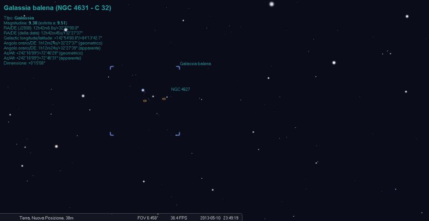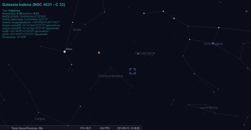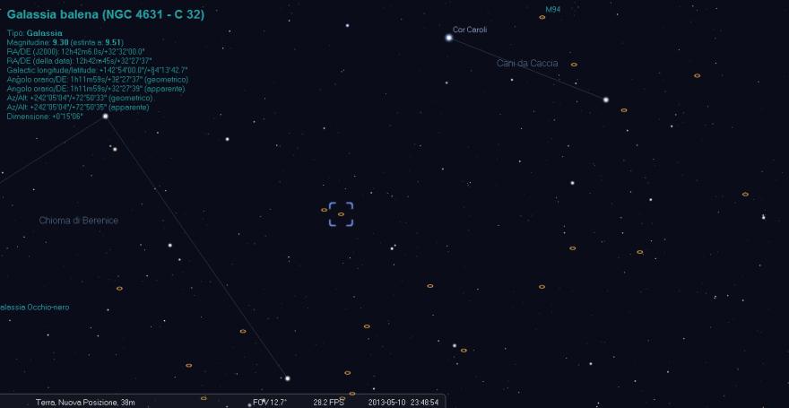 Scoperta da W. Herschel nel 1787 si trova nella costellazione dei Canes Venatici alle coordinate di AR 12h 42.1m e di DEC +32° 32’ , ha una magnitudine visuale apparente * di +9.8 che la rende ben visibile anche sotto cieli non perfettamente bui e senza grossi diametri, è interagente con la NGC 4627 (la piccola galassia ellittica subito a destra della 4631 nella foto) che perturba parte delle braccia della spirali, quest’ultima (la NGC 4627) è visibile con attenzione e sotto cieli discreti con un buon diametro avendo una Mag. apparente di +12.9.