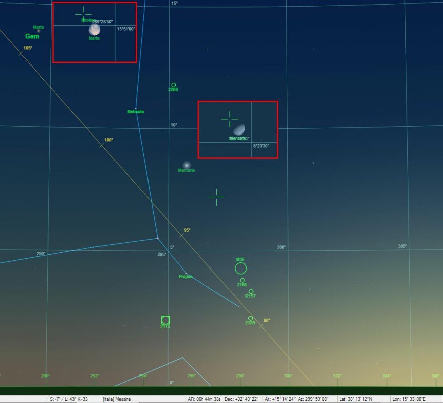 Ricordi per caso se erano visibili più in alto anche Castore e Polluce (dei Gemelli)? Te lo chiedo perché Mercurio era più luminoso, mentre Marte stava più o meno a pari magnitudine con le due stelle citate.