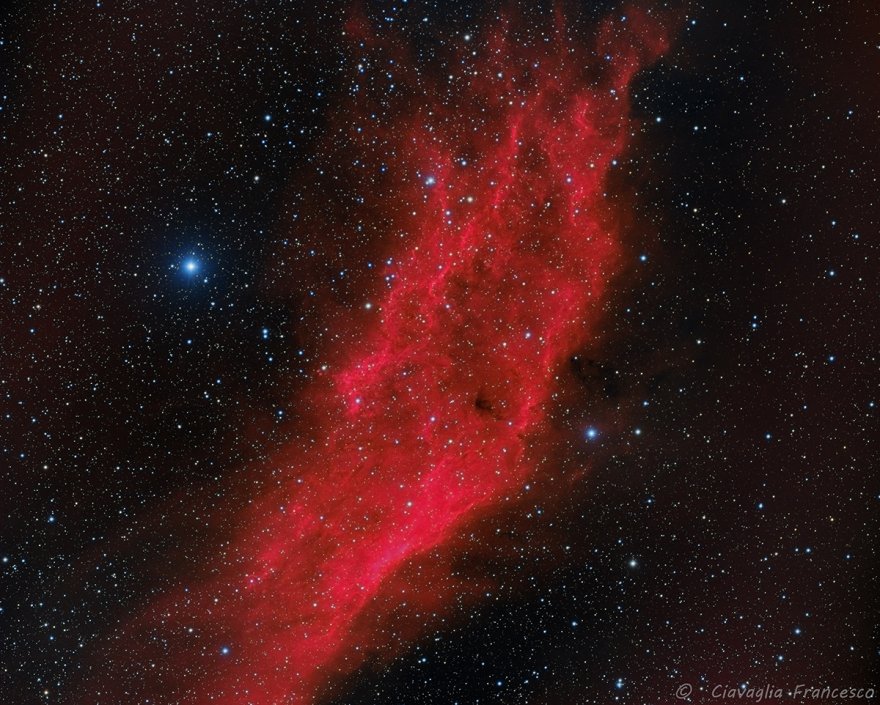 Buonasera pubblico il mio ultimo lavoro si tratta della NGC 1499 nebulosa ad emissione visibile nella costellazione di Perseo ad una distanza di 1000 anni luce, l'immagine è stata realizzata con:
