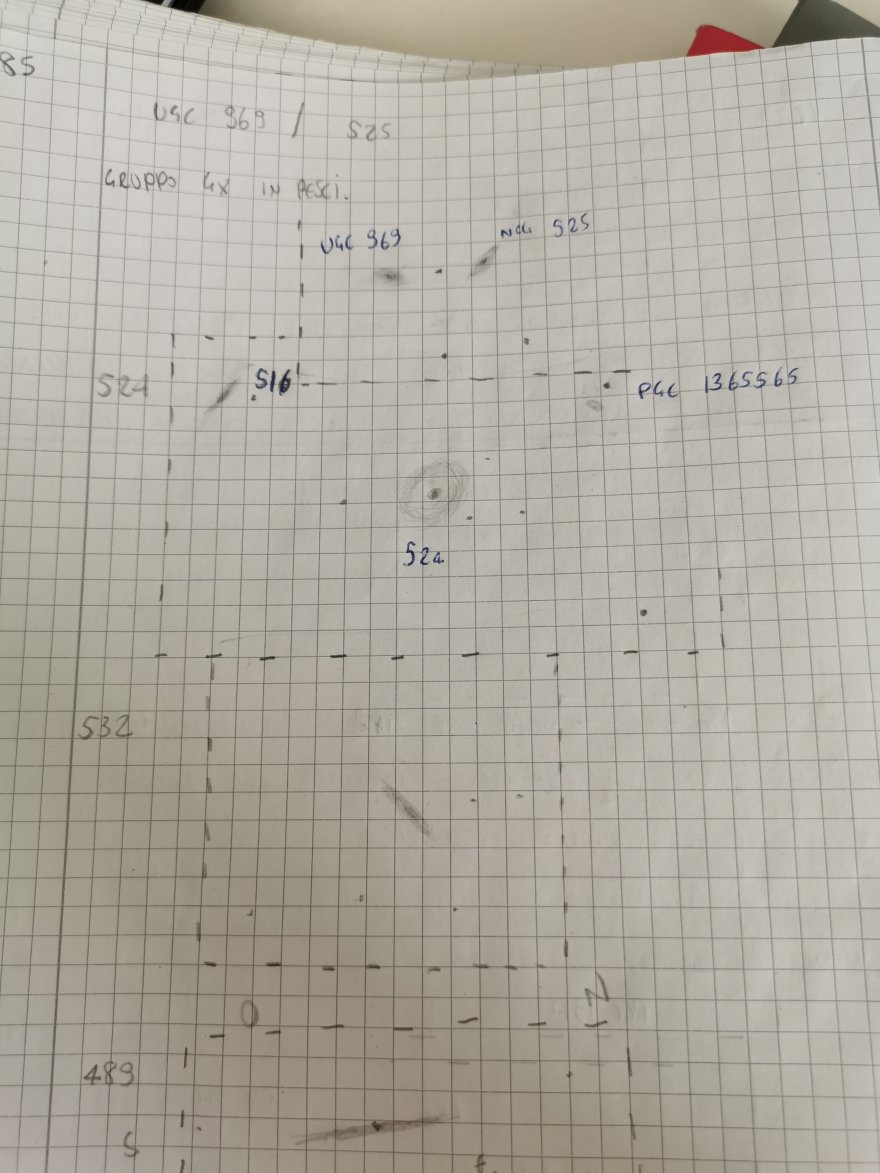 NGC 518 GX +13,3: mi ha lasciato il dubbio fino alla fine se averla vista oppure no, mi appare di aspetto stellare, poi vedo la foto in fase di report e mi rendo conto che la porzione di cielo è davvero quella ma non ho percepito minimamente la spirale, peccato vista anche la d.a. di 1,6’