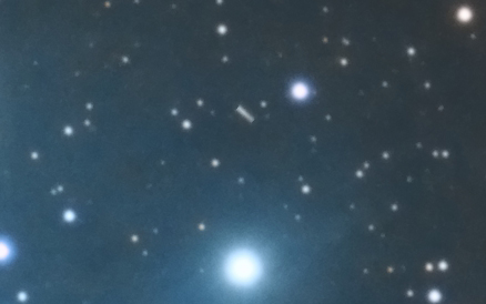 Alternativa, se si fosse trattato di qualcosa in cielo (non mi pare proprio): traccia mossa, non oggetto di forma definita. Ma il grande numero di pose da 180" lo escluderebbe. Quanto lento avrebbe dovuto essere in cielo? E poi, non termina con estremi tondeggianti, ma netti come si trattasse di un oggetto rettangolare.