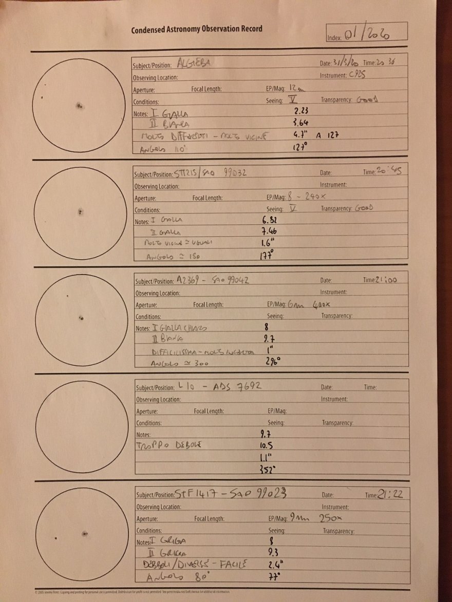 Osservazione: I Grigia, II Grigia, entrambe molto debboli, di diversa magnitudine. Separazione facile. Angolo stimato 80°.