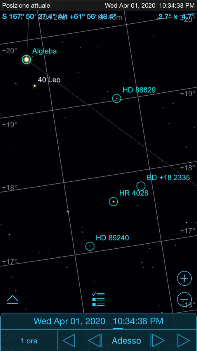 Son partito da Algieba, Gamma Leonis, bellissima stella doppia, posta a nord di Regolo. Per gli amanti del goto, sao81298. La primaria è gialla, la secondaria l'ho osservata bianca. Molto differente la luminosità, molto vicine a 195x. Angolo calcolato 110°