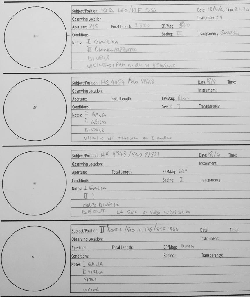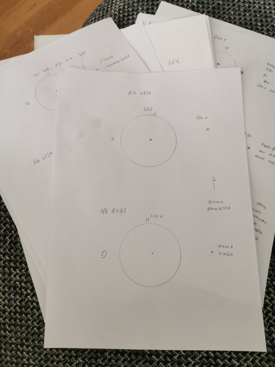In allegato trovate due immagini: la mappa della zona di cielo con evidenza delle stelle osservate e i miei appunti con i disegni.