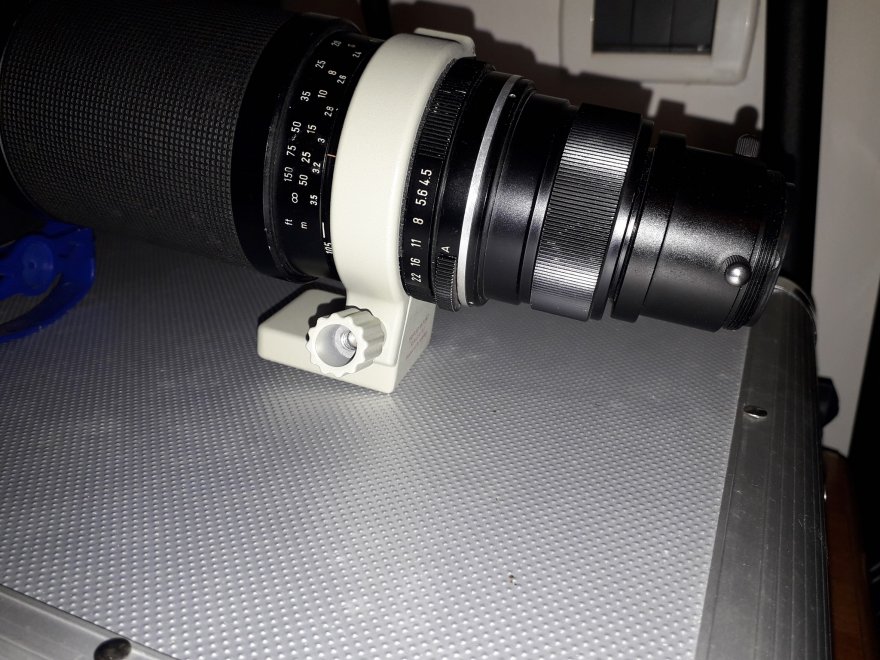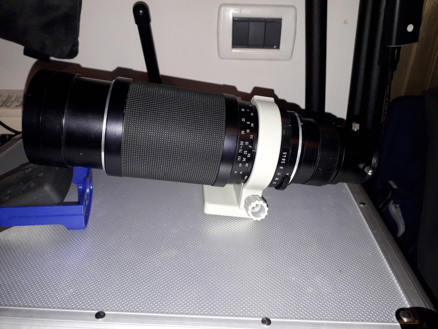 Ho adattato una culla per obiettivo canon che avevo,per poterlo montare su un cavalletto o montatura e poi ho avvitato un raccordo M42 a 31,8mm che avevo nella valigetta delle cose.