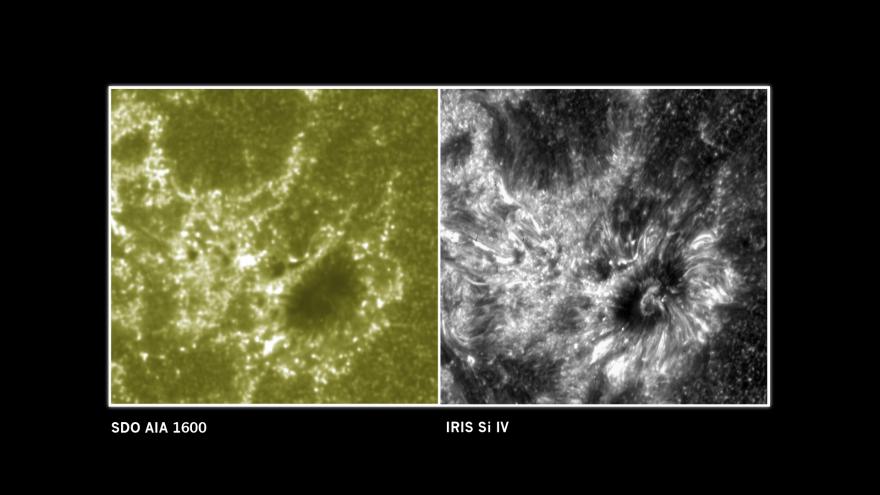 Sulla sinistra la stessa regione della bassa atmosfera solare osservata dalla sonda SDO.