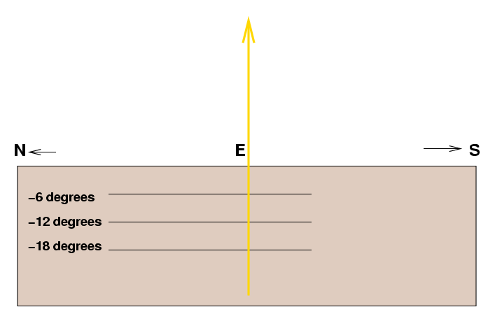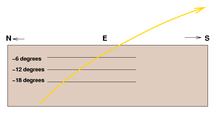 Noterai che il percorso non è più rettilineo, ma curvo, e inclinato. Quindi, se per chi si trova all'equatore il Sole apparentemente si sposta in linea retta di 6 gradi, per chi si trova ad una latitudine diversa il Sole salirà di 6 gradi ma si sposterà anche in orizzontale, magari di altri 6 gradi. Lo spostamento complessivo nel cielo sarà dunque maggiore (più o meno 8,5°).