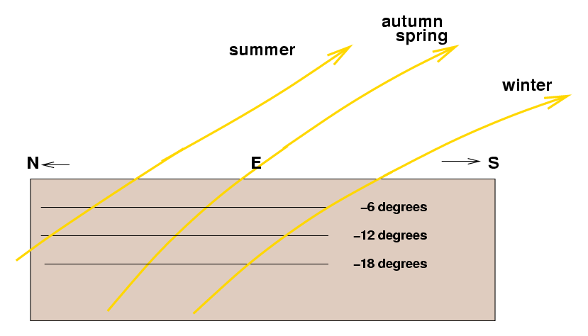 Nel corso dell'anno, poi, l'inclinazione cambia, e cambia anche il percorso del Sole, per esempio così: