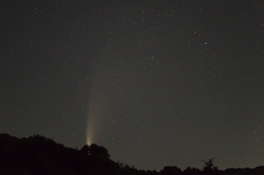 Oltre il pendio all’orizzonte una lunga fiamma azzurrata scaturisce dalla chioma di un albero come un incendio immaginario, freddo e impalpabile. La coda verticale della cometa si manifesta ancora prima del nucleo (che sorgerà parecchi minuti dopo), sola ed eterea sullo sfondo di in un cielo stellato, nell’immobilità che precede l’alba. Una scena che non avevo mai visto prima.
